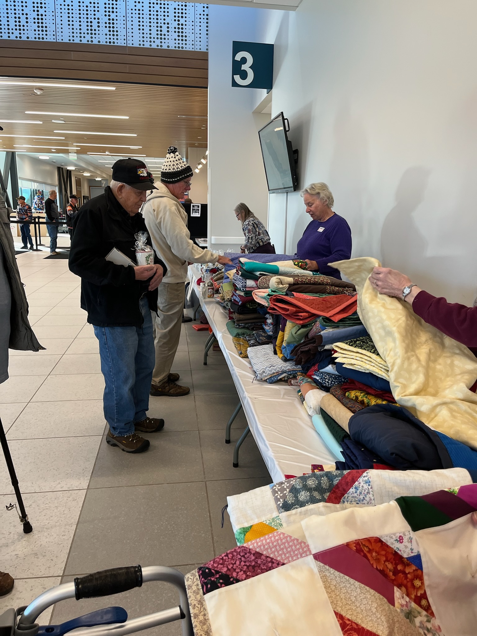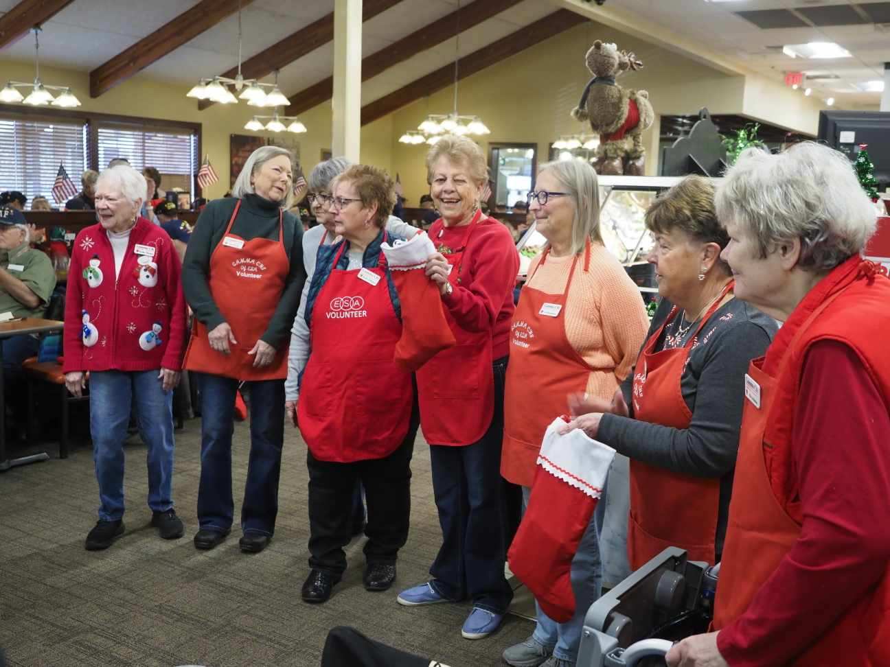 Members distribute Christmas stockings to veterans during the annual Veteran's breakfast at Golden Corral.